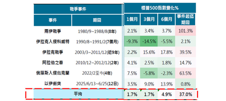 由於不確定風險升高及荷姆茲海峽呈現自主半封閉,預期黃金、原油及美債將受惠走揚,而軍工及航運類股也可望受惠。戰事發生,短期股市雖將呈現下跌,然評估近6次地緣衝突對中長期股市影響並不明顯(如下圖),市場仍將回歸至基本面。