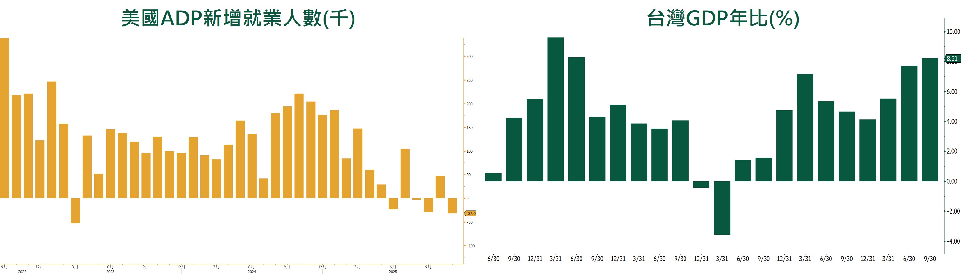 - 台灣 25Q3 GDP大幅成長+8.21%,遠高於市場預期,主因AI相關需求強勁,帶動出口及投資動能雙引擎。主計處同步上修2025年全年GDP成長率預測至7.37%,且在高基期下,2026年預估仍達3.54%,凸顯台灣景氣動能穩健。
