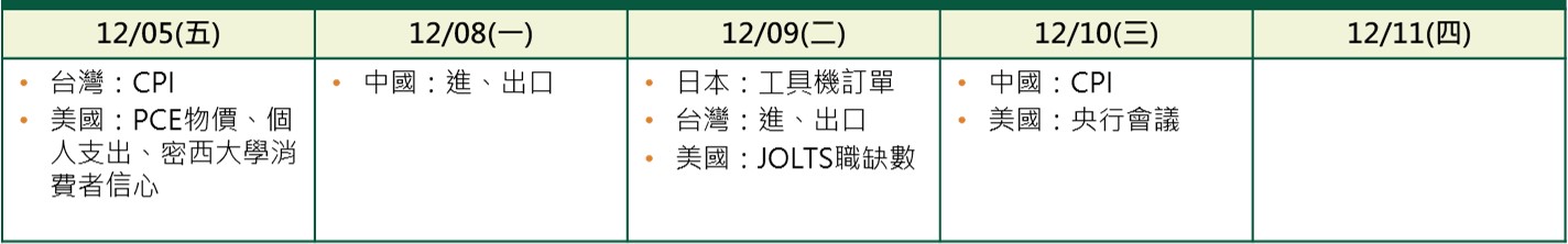 - 歐元區11月CPI年比+2.2%,略高於市場預期,而核心CPI則年比+2.4%,符合預期,整體通膨仍屬溫和可控,預料歐央行維持寬鬆貨幣政策。
