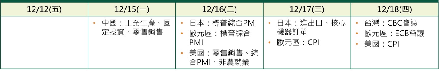 - 中國11月CPI年比上升至0.7%,符合市場預期,而PPI年比降至-2.2%,不如預期,顯示生產端價格仍持續走弱。整體而言,中國通膨仍呈現通縮格局,尚未看到明顯改善跡象。