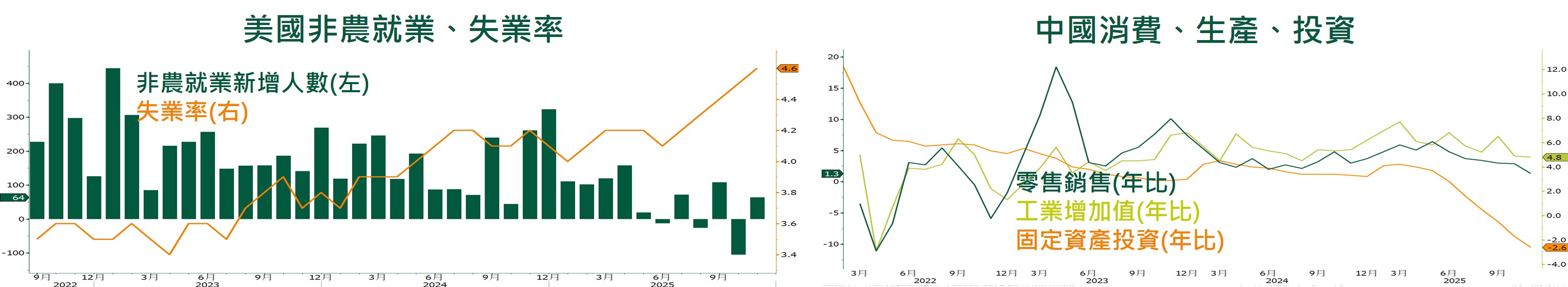 - 美國11月就業數據喜憂參半,非農就業人數增加6.4萬人,略優於市場預期,但失業率同步升至4.6%,創2021年以來新高,且高於預期,顯示就業市場呈現成長乏力、結構分歧的狀態。受政府停擺影響,BLS同步公布10月非農就業人數減少10.5萬人,主要受到政府部門就業大幅減少16.2萬人拖累,而因無法回溯蒐集10月家庭調查資料,當月失業率未予公布。
