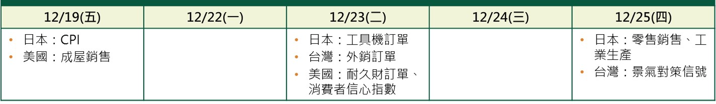 - 美國11月CPI、核心CPI年比+2.7%、+2.6%,皆遠低於市場預期,顯示物價壓力持續降溫。然而,這份延後公布的通膨報告因涵蓋美國政府關門期間,資料蒐集受限,同時缺乏10月數據,使數據解讀上仍存在不確定性。