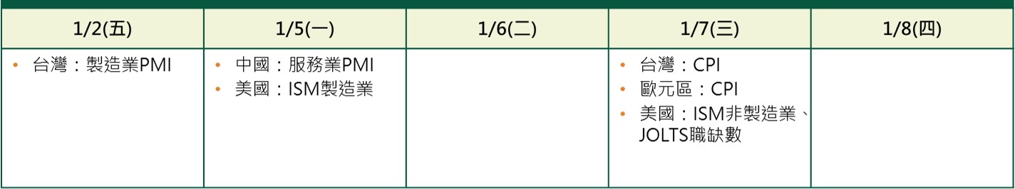 - 中國12月官方製造業與非製造業PMI分別為50.1、50.2,雙雙重返擴張區間且優於市場預期,顯示整體景氣有所回溫,其中製造業供需兩端明顯改善;非製造業方面,服務業小幅回升,建築業則顯著回升。