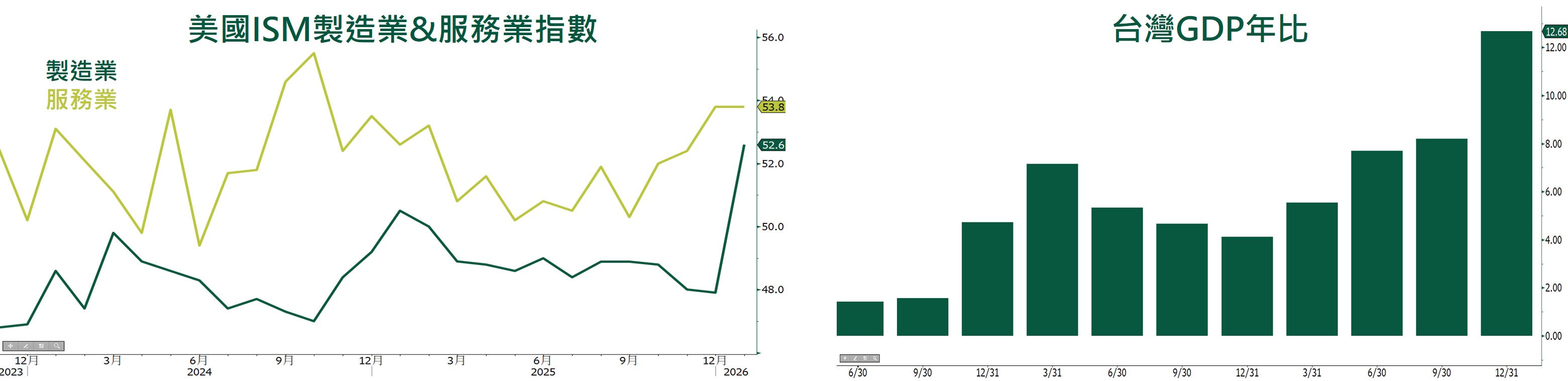 - 美國1月ISM製造業指數回升至52.6,重返擴張區間,並創2022年以來新高,主要受到新訂單和生產強勁成長的推動,同時客戶庫存水位偏低,後續訂單與生產動能可望持續獲得支撐;ISM服務業指數持平於53.8,商業活動與交貨時間支撐PMI數據,惟新訂單與新出口訂單轉弱、就業趨近榮枯線且成本壓力回升,顯示需求歷經高峰後回落,未來成長動能恐受抑。