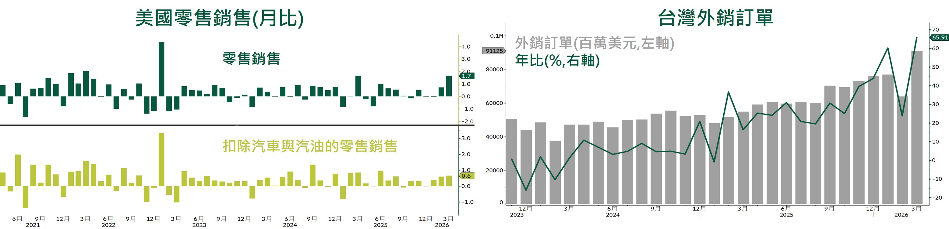 - 台灣3月外銷訂單金額達911.2億美元(YoY+65.9%),遠超市場預期,持續受惠於AI浪潮帶動新興科技應用需求熱絡,推升資訊通信及電子產品訂單成長,3月接單分別YoY+120.9%、+73.7%。展望未來,隨著AI投資持續擴大,外銷訂單動能可望維持強勁。