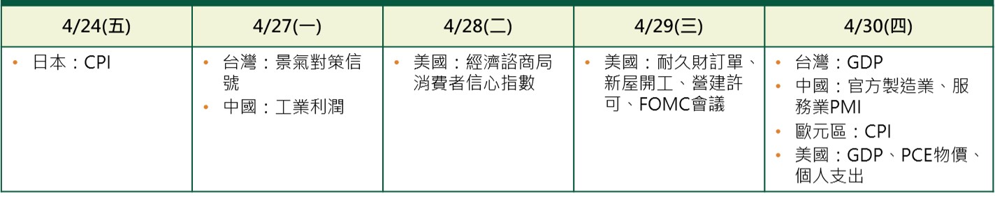 - 歐元區4月標普製造業PMI升至52.2,優於市場預期,但服務業PMI則跌破榮枯線至47.4,不如預期,反映中東衝突推升油價,已開始對消費者形成壓力。