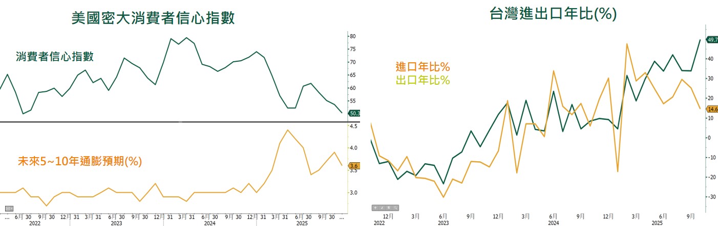- 美國11月密大消費者信心指數降至50.3,現況指標降至52.3,預期指標則降至49.0,均不如預期,由於消費者擔憂政府關門或對經濟造成負面影響,導致消費者信心跌到3年多以來低點,不過,通膨預期相對穩定,長期通膨預期由3.9%降至3.6%。