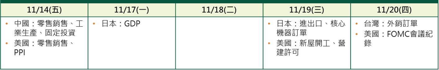 - 受惠政府關門有望結束,提振市場樂觀情緒,帶動美股走揚,不過隨著多位Fed官員談話偏鷹,以及軟銀出售輝達持股,加深AI科技類股過熱疑慮,美股表現分歧,最終近一周道瓊、S&P500分別上漲1.16%、0.26%,那斯達克指數則下跌0.80%。