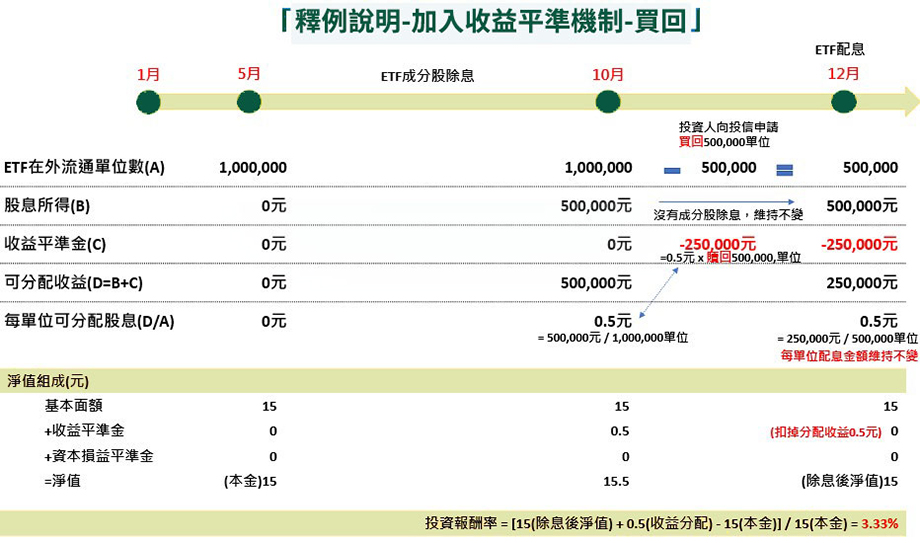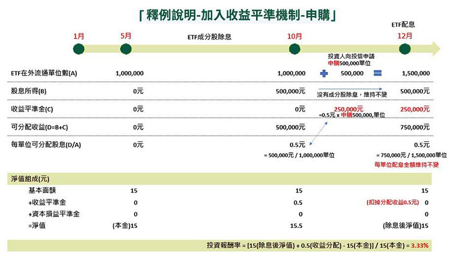 ETF將收益平準金納入可分配範圍,避免配息前的大量申購交易而導致稀釋配息。