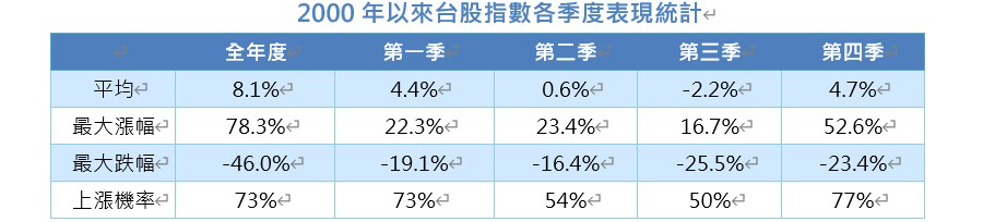 觀察自2000年以來,台灣加權指數在第一季與第四季向來是相對突出的雙旺季,平均漲幅分別為4.4%與4.7%,上漲機率皆達七成以上(見表),明顯優於其他季度。從過去經驗來看,第一季台股表現良好的年度,全年走勢多半表現不弱,因此首季表現常被視為全年度行情的風向球,Cmoney資料統計2000年以來台股年度平均漲幅達8%,最大漲幅曾高達78%。