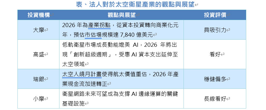 除此之外,法人和大型研究機構對太空產業的態度也明顯轉向積極,近期陸續提出正向的投資評估觀點(表)。根據大摩在今年1月的報告中指出,太空科技產業投資評價由中性上調至具吸引力,點出2025年可視為太空產業的基礎元年,而2026年在發射次數增加、各國政策支持與技術成熟度提升下,產業投資潛力將更受矚目;高盛則把太空的成長動能與AI並列,認為AI帶動的龐大資本支出,將一路延伸到太空領域,同時也具備各國軍備競爭與地緣政治紅利。