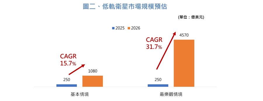 根據WEF與麥肯錫的研究指出,全球太空經濟規模預計從2023年的6,300億美元成長至2035年的1.8兆美元,年複合成長率約9%,太空產值的成長速度預期可望高於全球GDP的增長速度。其中,成長最快速的區塊之一,正是與SpaceX關聯度極高的低軌衛星領域。高盛預估,低軌衛星市場正迎來快速擴張期,在基礎情境下,年複合成長率達15.7%;若以最樂觀的情境推估,市場規模可能在同期間飆升至4,570億美元,年複合成長率達31.7%,成長速度相當於目前市場最熱鬧的AI產業。