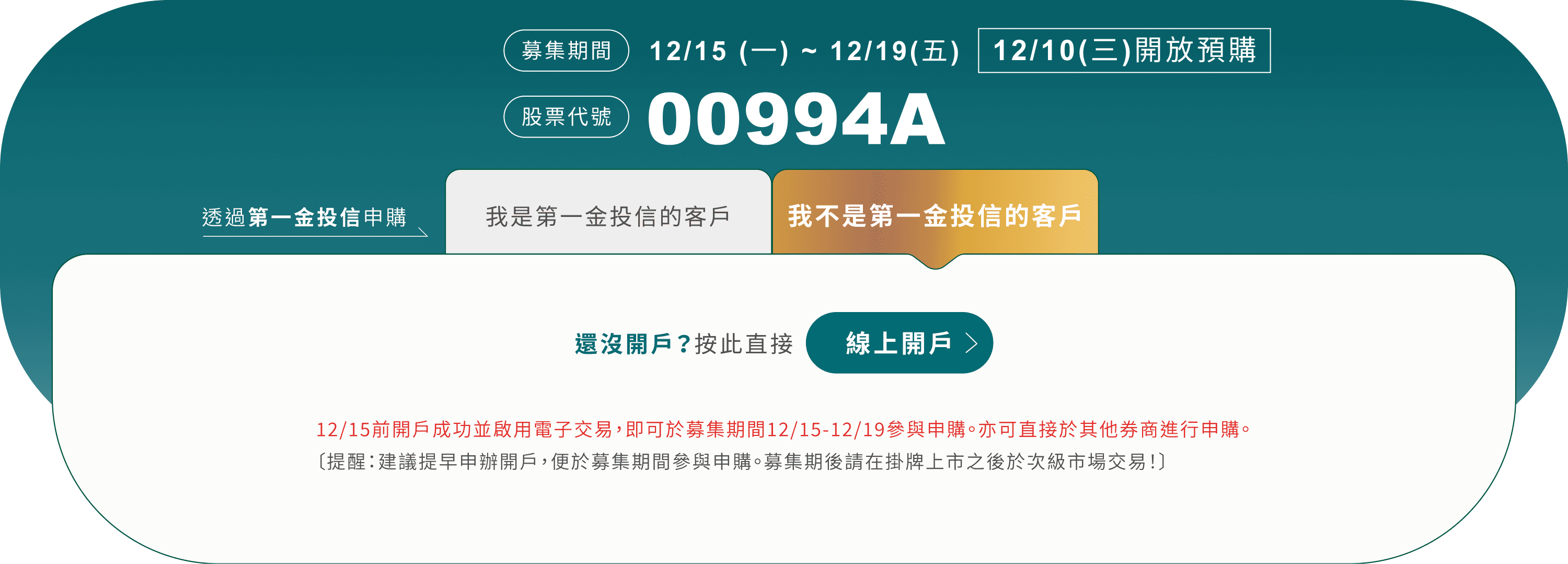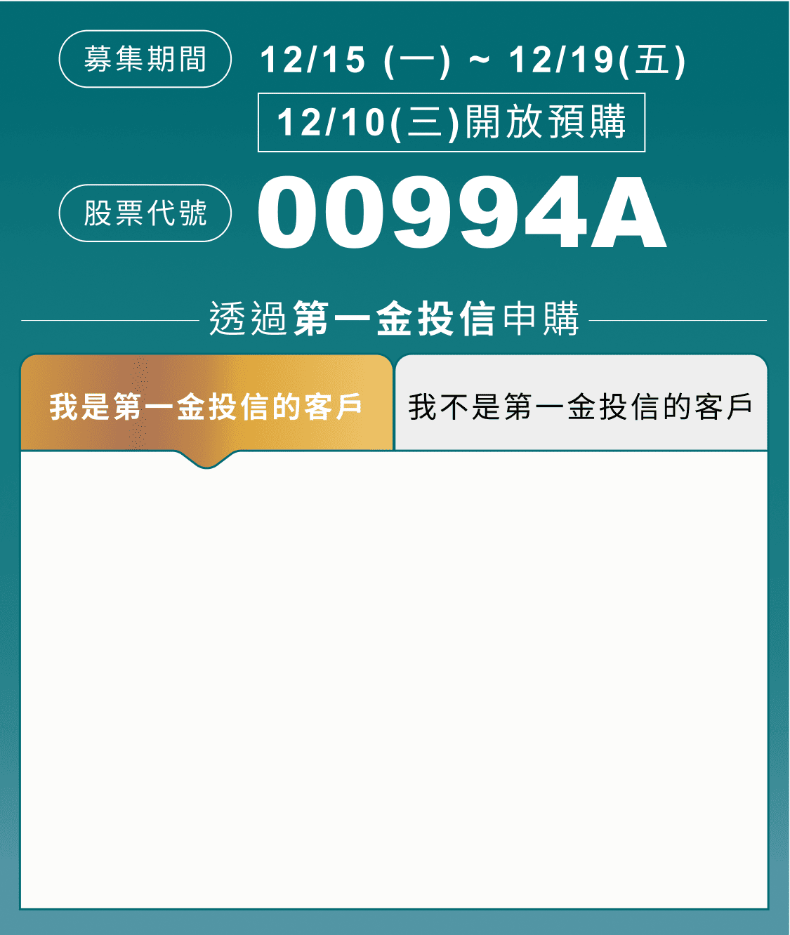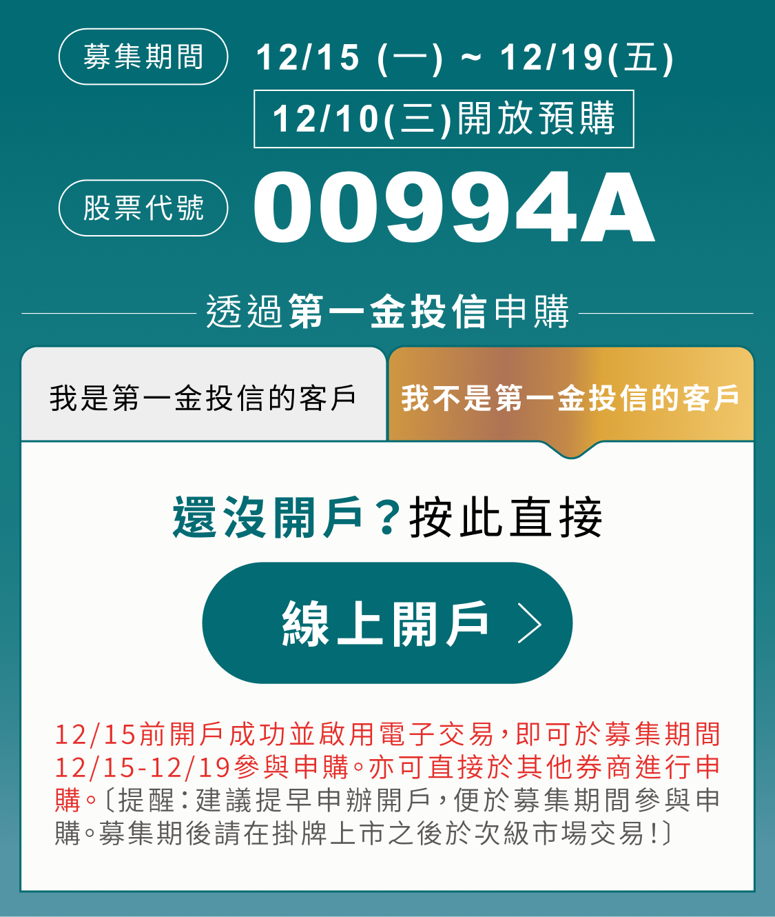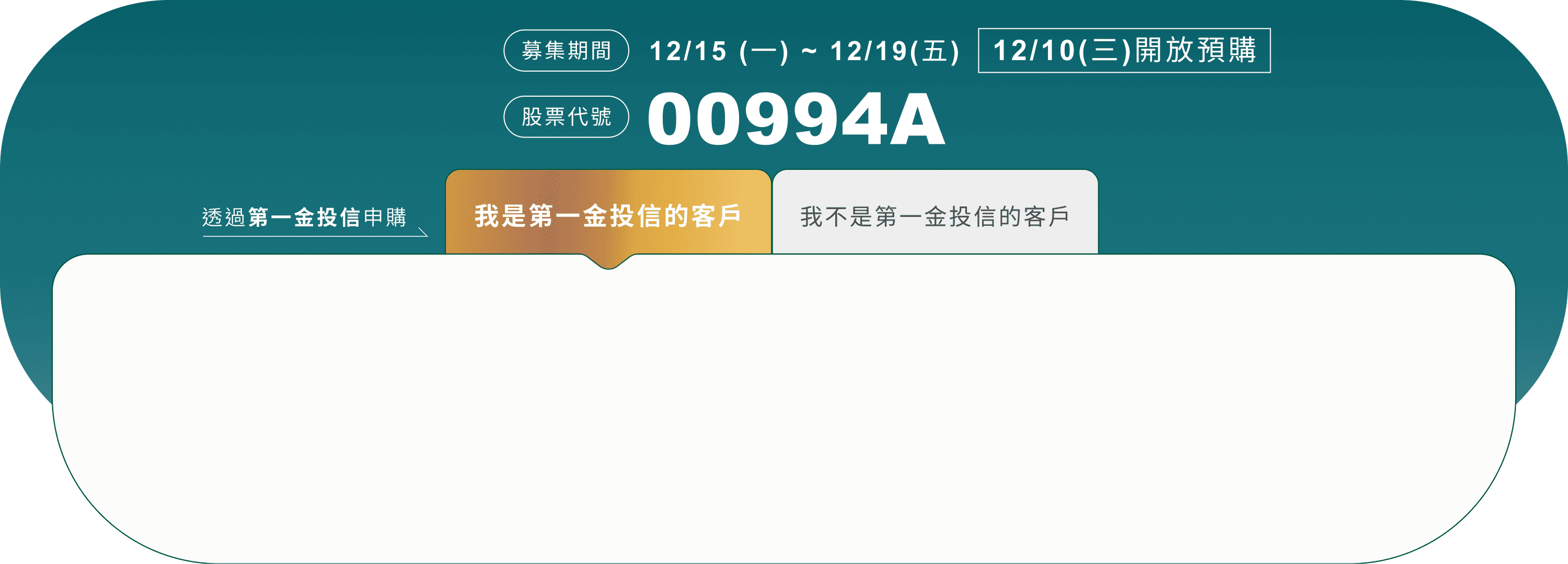 【ETF風險聲明】第一金投信獨立經營管理。基金經金管會核准或同意生效,惟不表示絕無風險。基金經理公司以往之經理績效不保證基金之最低投資收益;基金經理公司除盡善良管理人之注意義務外,不負責基金之盈虧,亦不保證最低之收益,投資人申購前應詳閱基金公開說明書。有關基金運用限制、手續費之收取方式、投資人應直接或間接負擔之相關費用、紛爭處理、申訴管道及基金之相關投資風險等已揭露於基金之公開說明書中,基金經理公司及各銷售機構備有公開說明書,歡迎索取,或自行至基金經理公司官網(www.fsitc.com.tw)或公開資訊觀測站(mops.twse.com.tw)下載。掛牌上市前參與申購所買入的每單位淨資產價值,不等同於基金掛牌上市後之價格,參與申購之投資人需自行承擔基金成立日起至上市日止之期間,基金價格波動所產生折/溢價之風險。基金需負擔之相關費用,包括每日進行部位調整產生之交易價格差異與交易費用及基金其他必要之費用(如經理費、保管費、上市/上櫃費等),將影響所有ETF基金追踨表現。